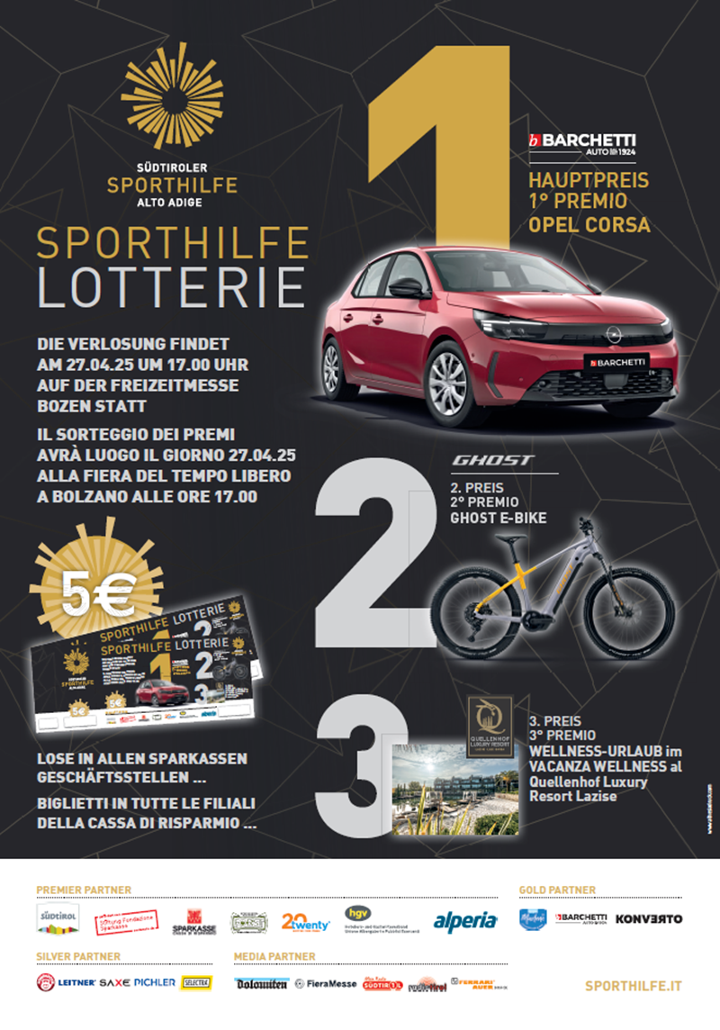 Die Sporthilfe Lotterie gehört seit Jahren zu den finanziellen Standbeinen der Südtiroler Sporthilfe: dabei kann man nicht nur hinreißende Preise gewinnen, sondern vor allem die jungen, talentierten Sportler/innen des Landes während ihrer sportlichen Karriere begleiten und unterstützen!